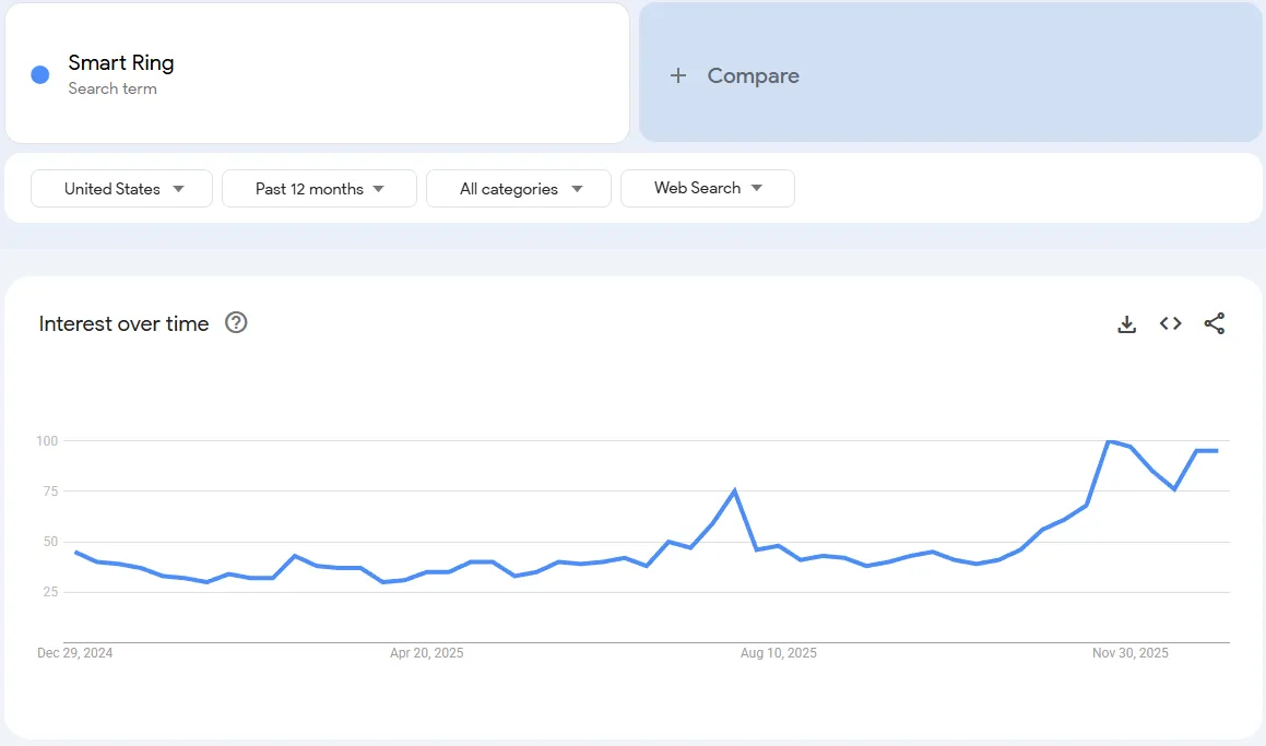 Spójrz na wykres powyżej. To jest liczba wyszukiwań hasła „Samsung Ring” w ciągu ostatnich 90 dni. Widzisz ten ogromny wzrost w listopadzie? Oznacza to, że Samsung wydaje miliony dolarów na edukację twój przyszłych klientów. Wgląd: Opinia publiczna już wie, czym jest inteligentny pierścień. Jednak większość konsumentów nie jest skłonna zapłacić 399 dolarów. Trend wyszukiwania stabilizuje się, co oznacza, że „faza szumu” dobiegła końca i rozpoczęła się „faza zakupów” w przypadku niedrogich opcji (50–80 USD).
