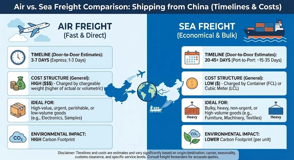 (Powyżej: Infografika porównująca fracht lotniczy i morski dla wysyłki z Chin, podkreślająca harmonogramy i koszty)
